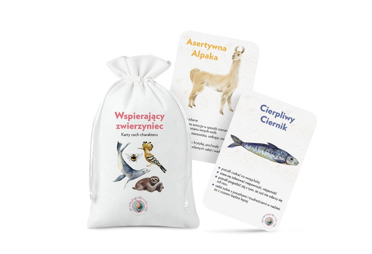 Zestaw składa się z 45 dwustronnych kart z opisami cech i rysunkami zwierząt. Karty służą do rozwijania samoświadomości i odnajdywania swoich zasobów. Pomagają w przełamaniu nieśmiałości, trudności w mówieniu o sobie, pozwalają na wspólne spędzenie czasu.